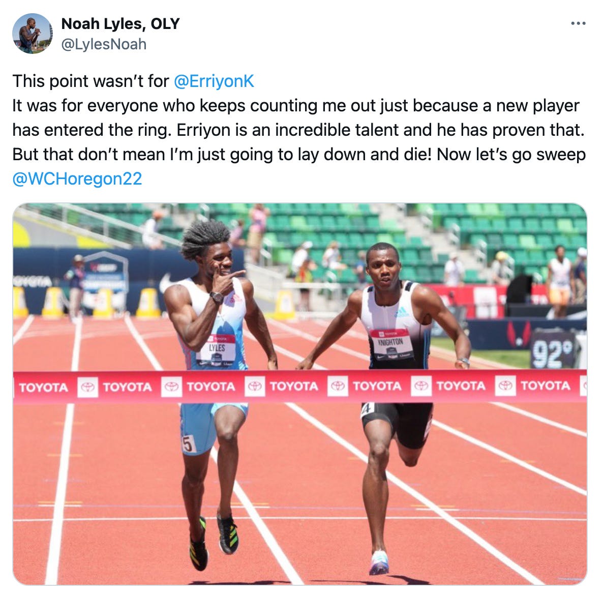 Back to the top about the controversial finger point by Noah Lyles. He explained what it really meant: